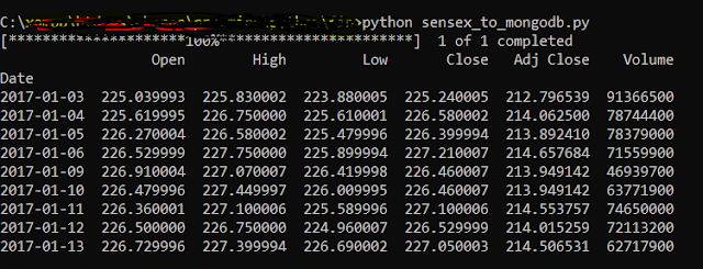 Here we use pandas library to insert dataframe into Mongodb. I am taking Yahoo finance library to get dataset for a ticker and save that data into Mongo.